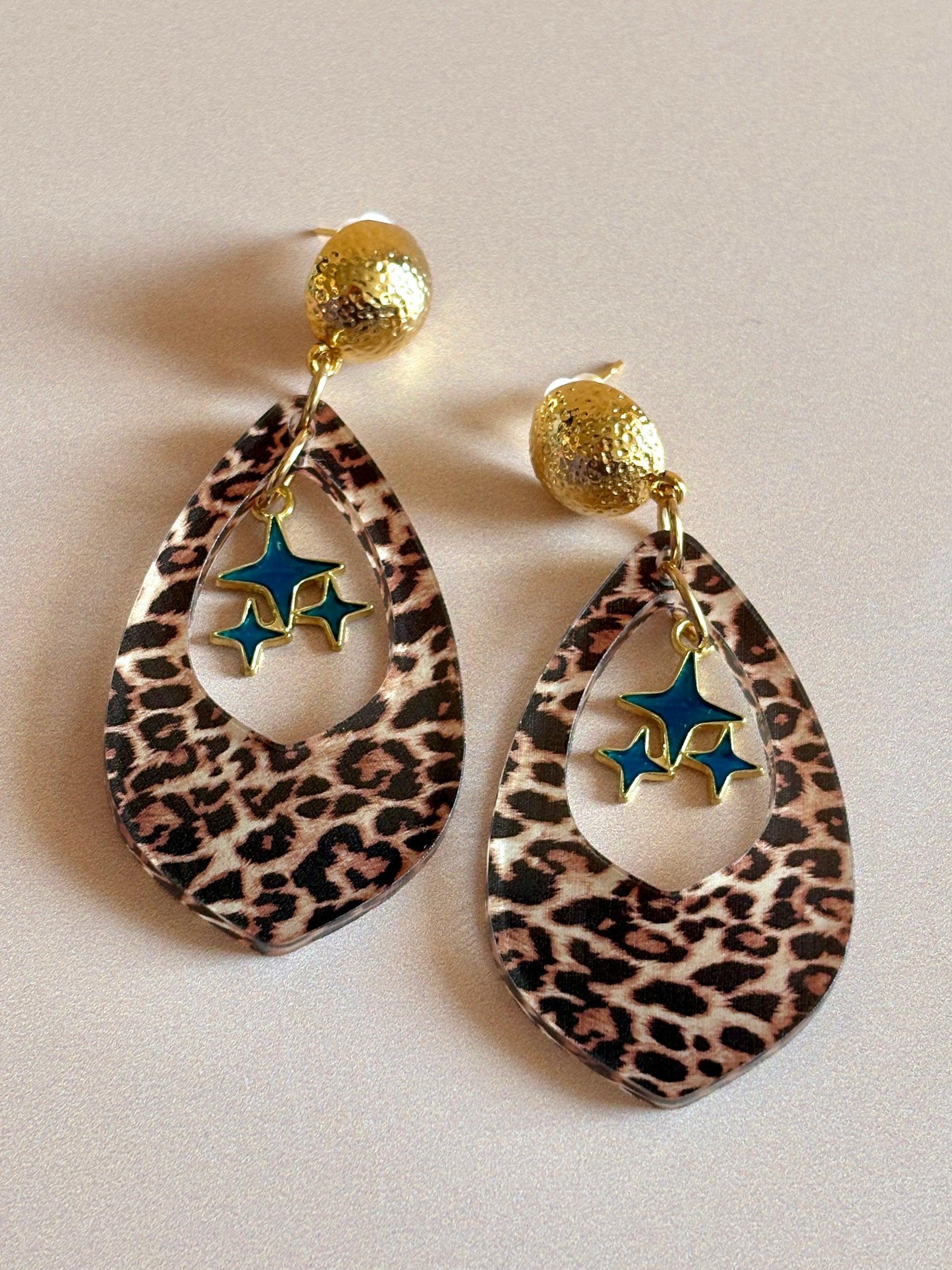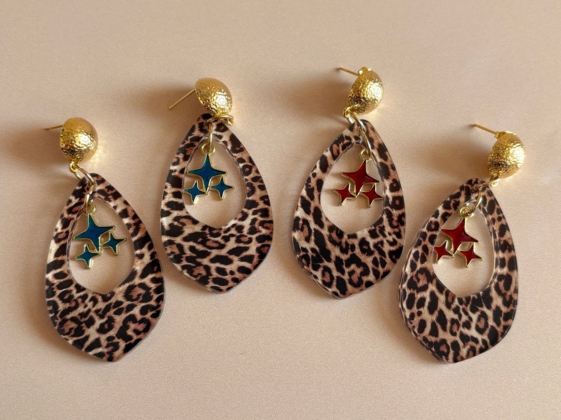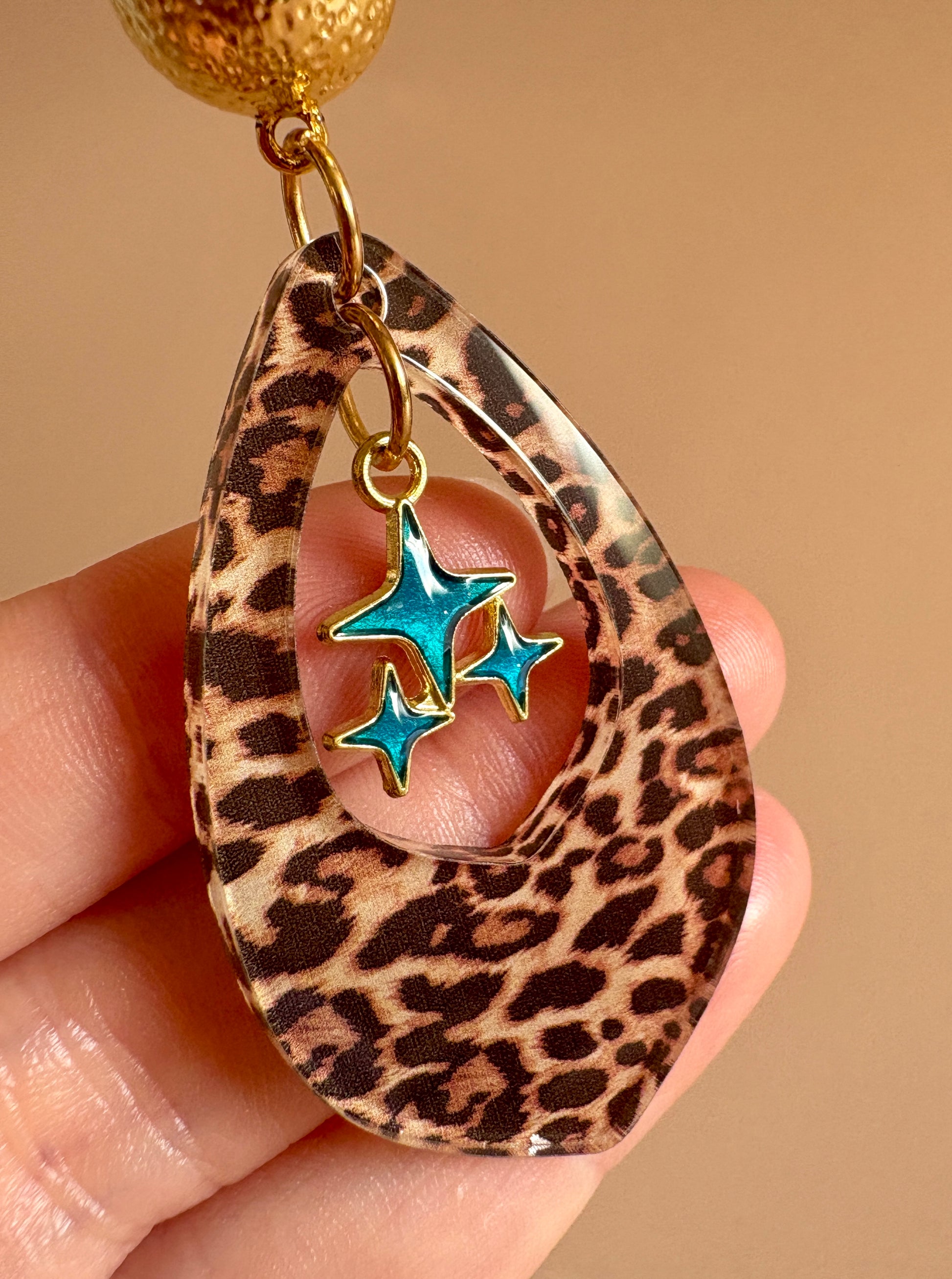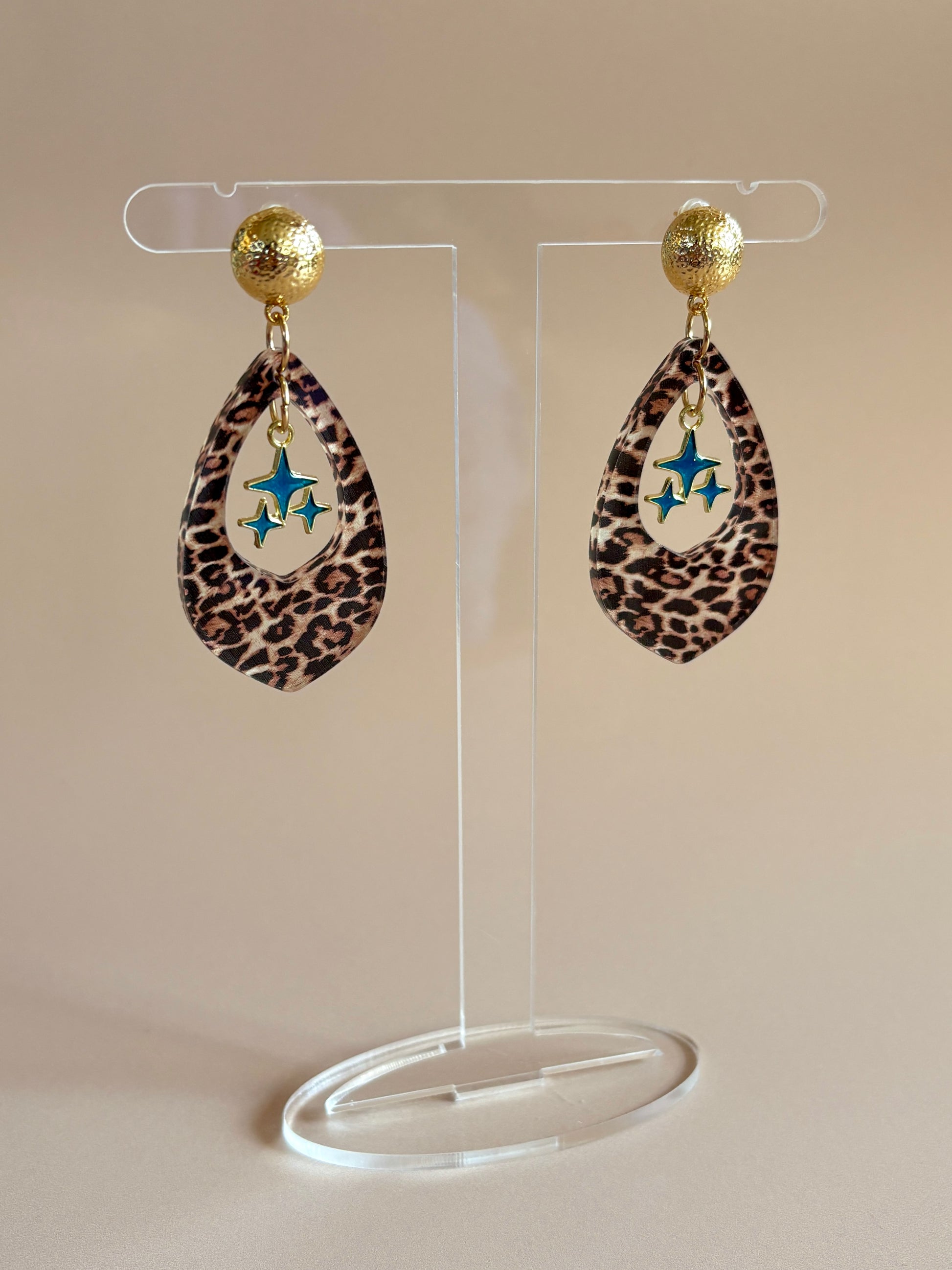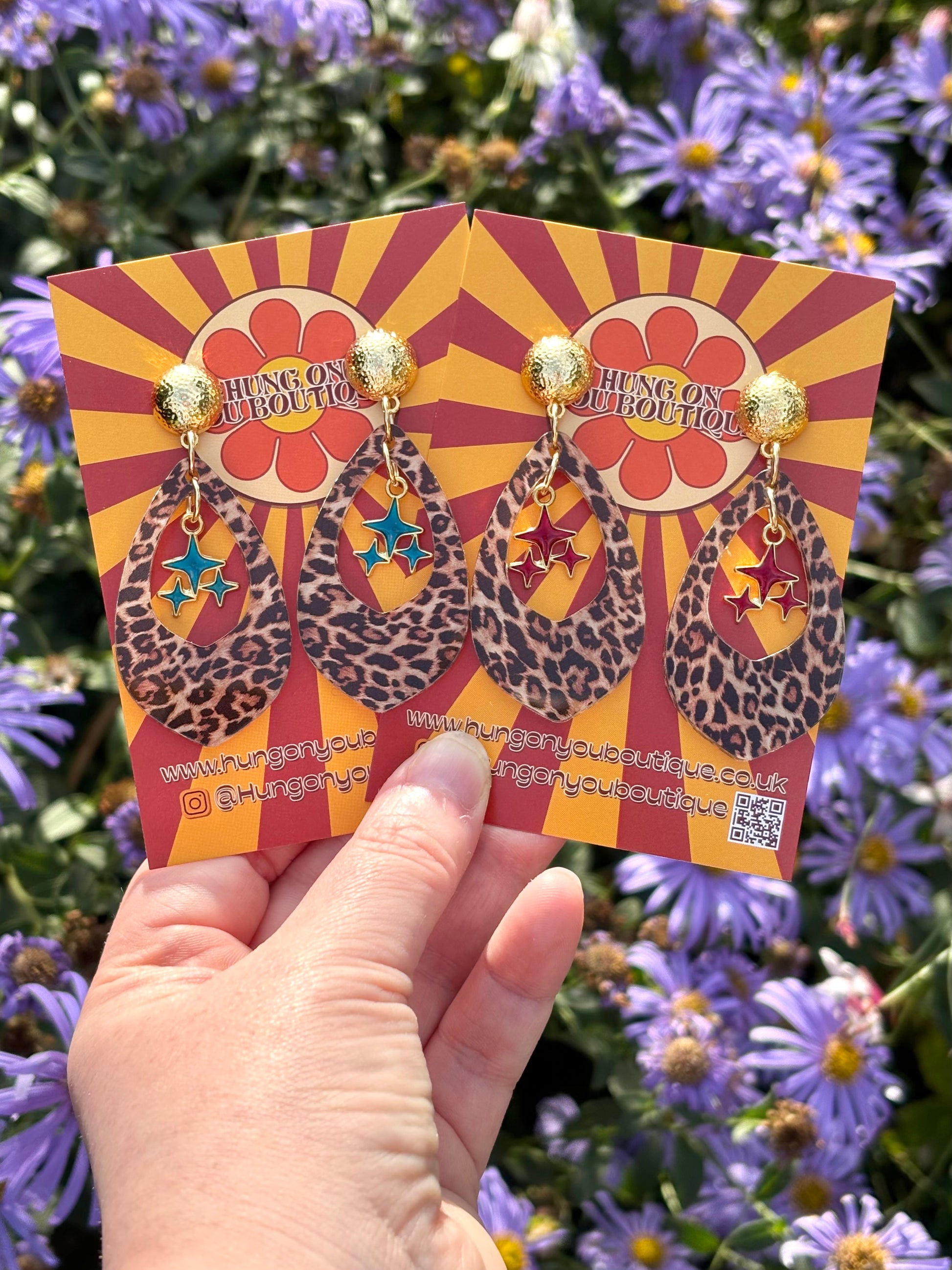 Bring bold mid-century energy to your look with these Leopard Cosmic Drops. Featuring a glossy, glass-look leopard teardrop paired with a dangling shimmery enamel star, these earrings blend 50s atomic style with modern leopard print attitude.