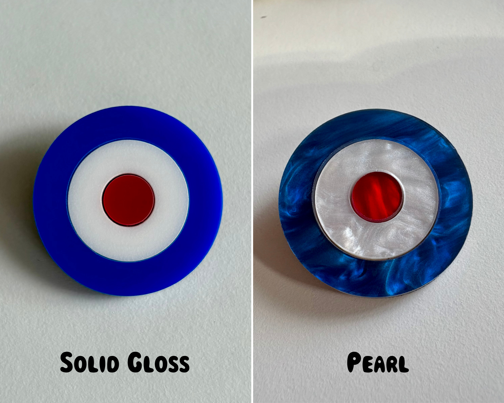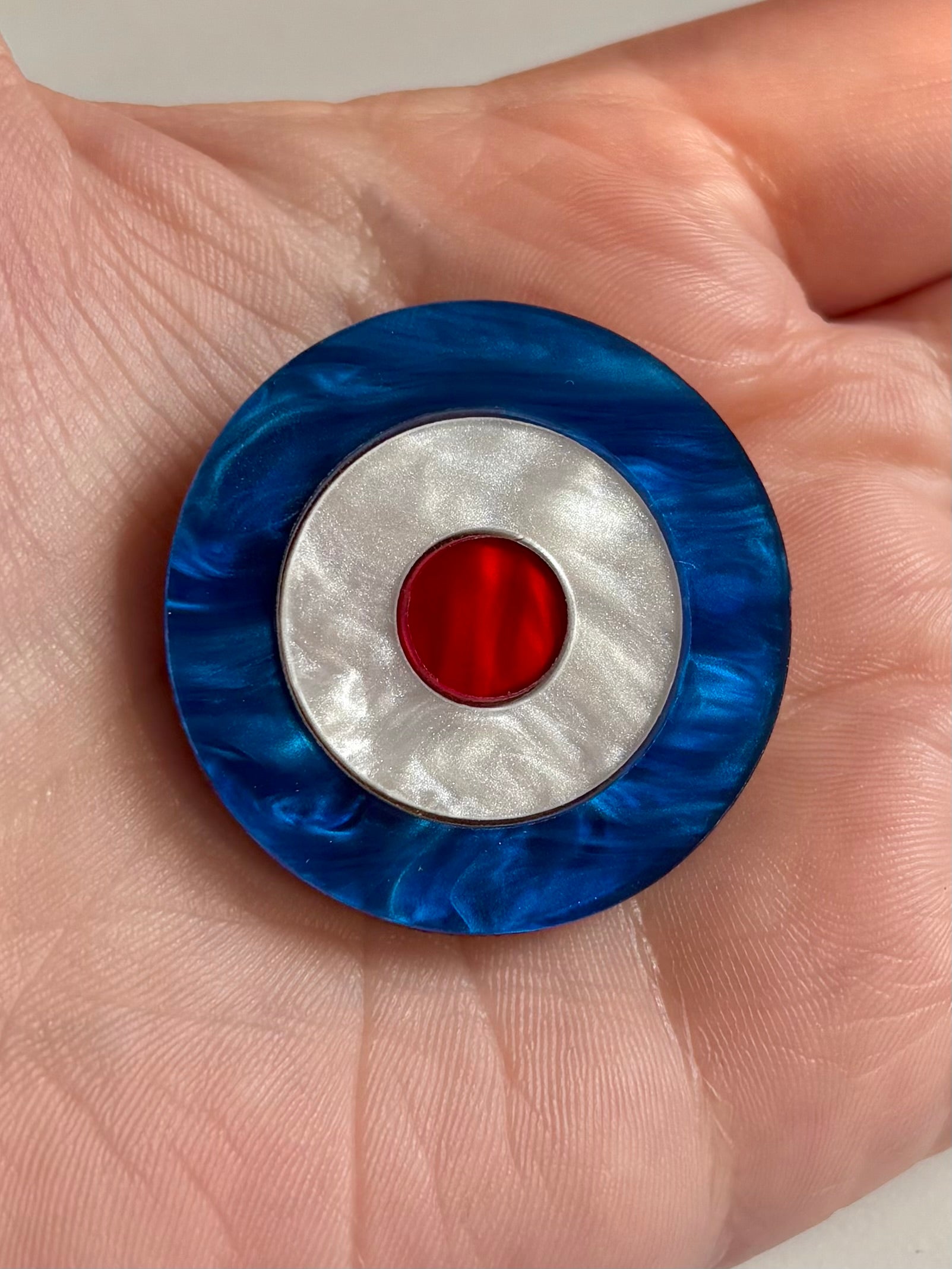 Bring a touch of bold 60s Mod culture to your look with this handmade acrylic Target Brooch. Designed and hand-assembled in the UK, each piece combines glossy or pearl acrylic with a smooth wood veneer backing for a high-quality retro finish.